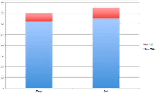When I started the second growth program I weighed in at 70 kilos with a body fat percentage of 11.3 %. This meant I had 7.94 fat and 62.06 kilos of lean mass.