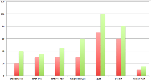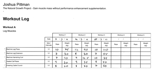 My workouts were split into 3 upper body and 3 lower body exercises with a core exercise on each workout. I didn’t know how exactly much protein I consumed on a day-to-day basis but I was eating lots. I was supplementing with a protein shake, I had eggs for breakfast and at least some form of meat through the day.