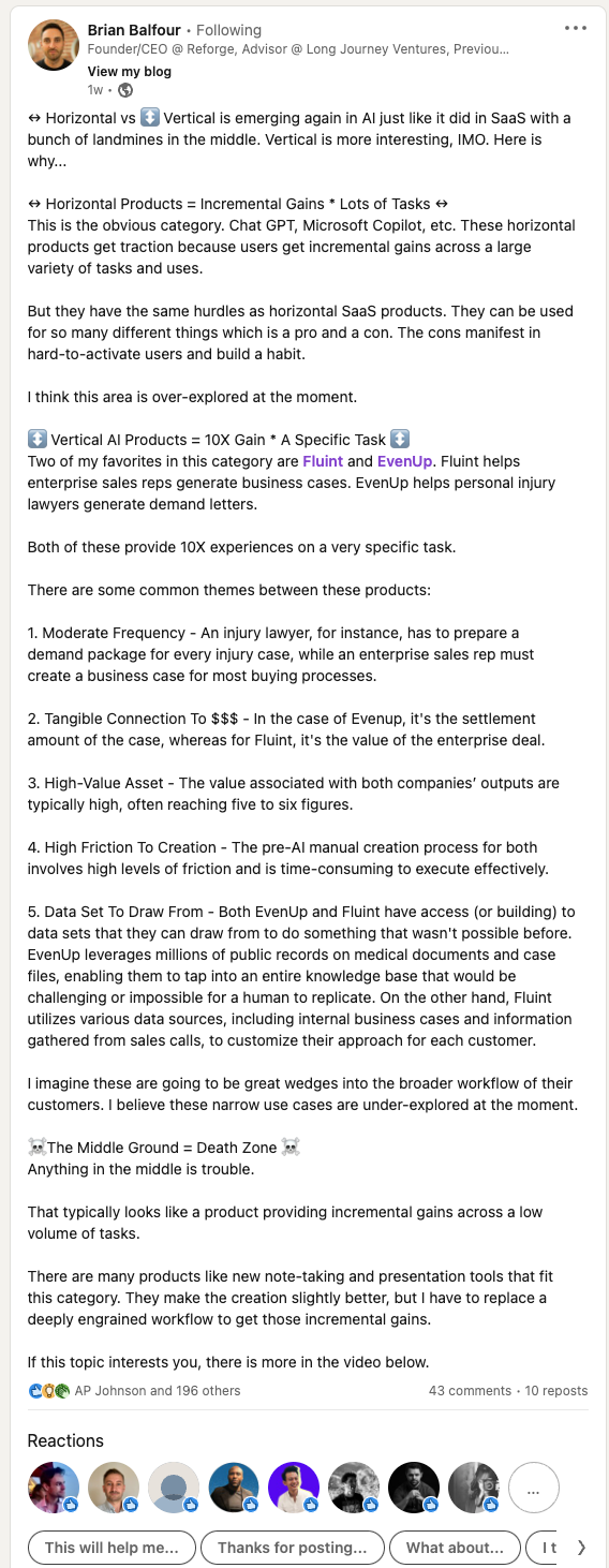 He talks about how two types are AI products are emerging. Horizontal products like ChatGPT that can do everything well and vertical products, like Fluent and EvenUp, that only do one thing, but do it exceptionally well.