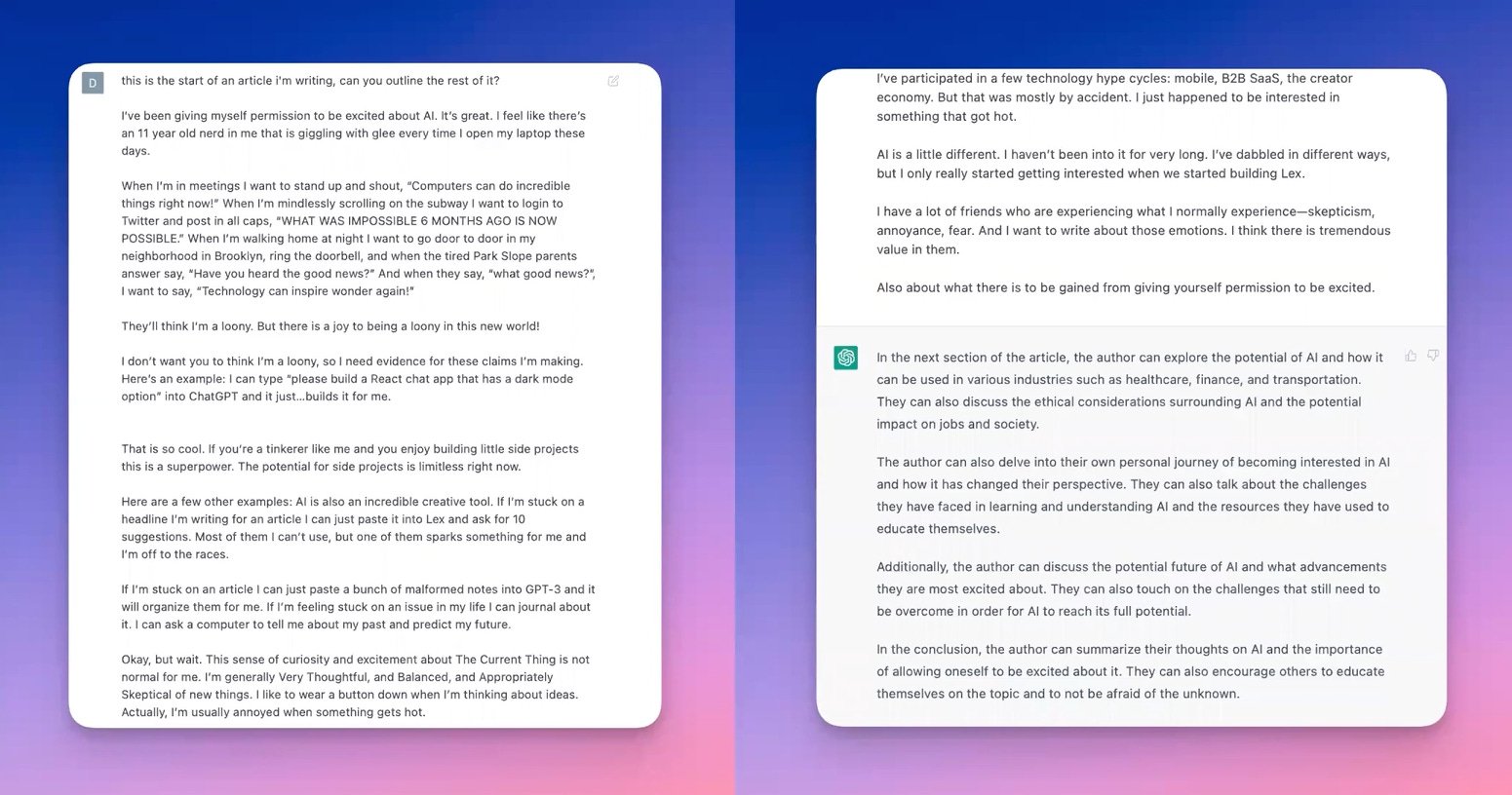 When Dan gets stuck writing, he will copy in what he’s so far and ask for an outline of the rest.