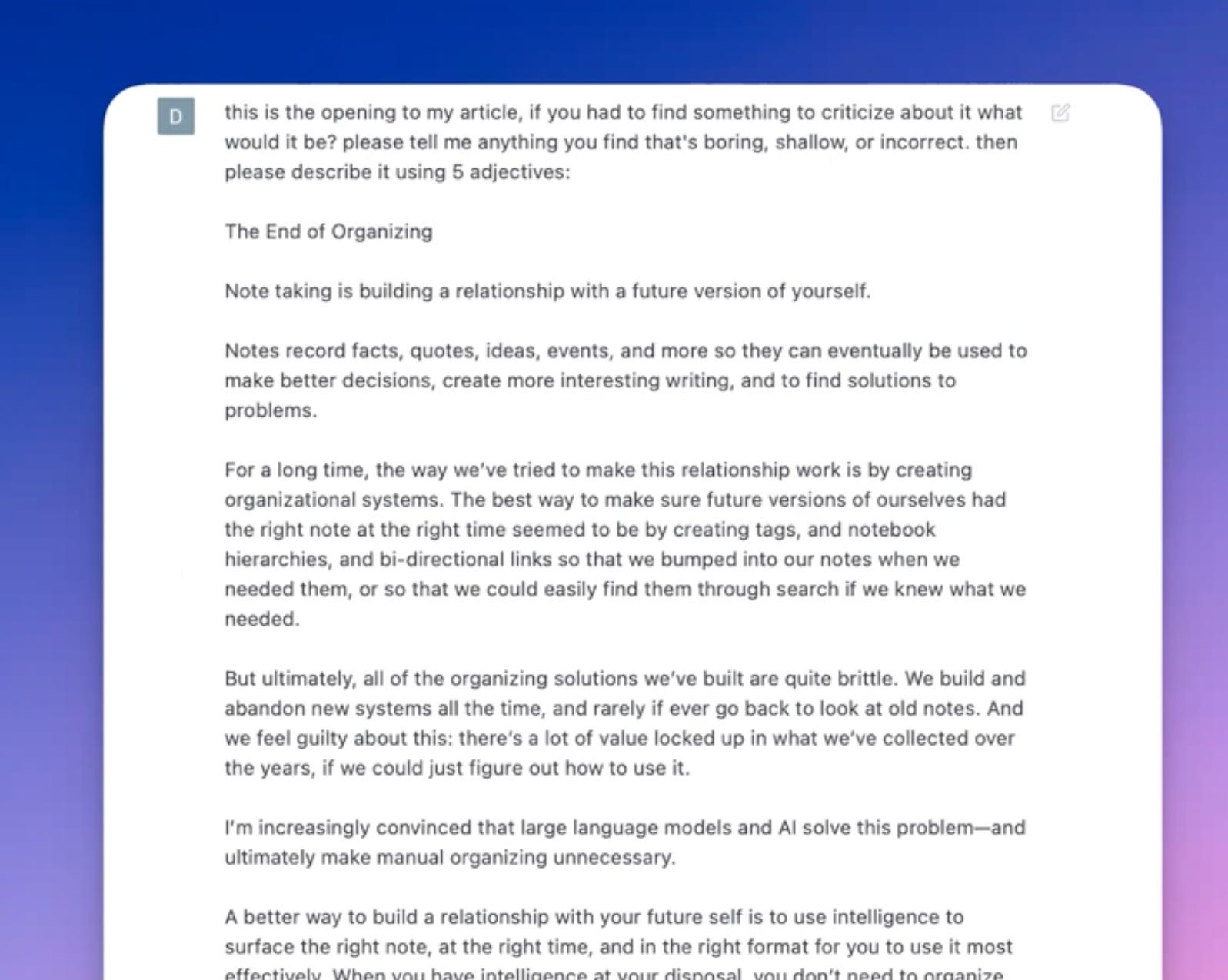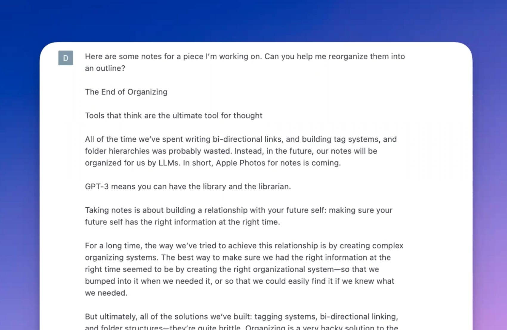 Another way Dan uses ChatGPT involves feeding his notes into a prompt and asking for an outline. This serves as a useful way to find the best connective tissue between ideas before committing to the writing process.