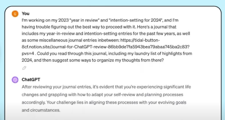 - Ask ChatGPT to read through your entries and provide a summary of major themes, patterns, and insights (e.g., “I’m working on my [year] review and I’ve compiled my journal entries from the past [time period]. I’d like your help in analyzing and organizing my thoughts. [insert journal entries]”).