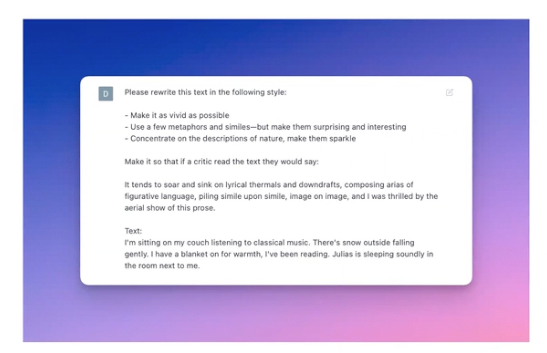 ChatGPT excels at style. If you have a piece of writing and you want to inflect it with flavor, you can list out specific stylistic interventions in bullet points, like Dan has done in the prompt below.