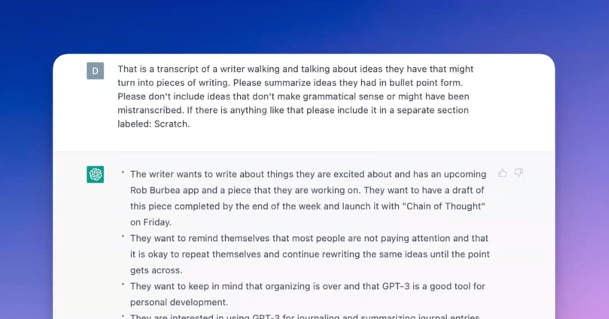 Dan writes interesting articles about artificial intelligence for his publication called ‘Every‘. When he has an idea for an article, he will capture it by recording a voice note. He will then take a transcript of this messy, initial version of the idea and ask ChatGPT to summarize it into bullet points for later.